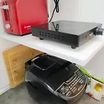 Ein Kühlschrank, ein Herd und Küchenutensilien gehören zu den Annehmlichkeiten in der Küchenzeile.